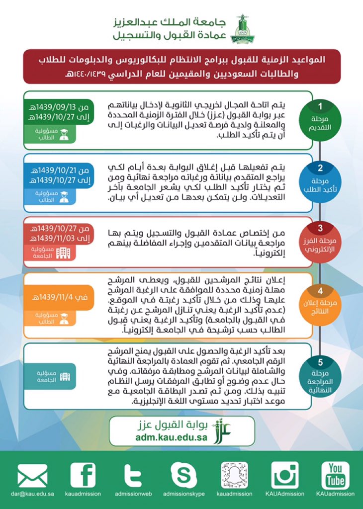 مواعيد التسجيل في جامعة الملك عبدالعزيز. جامعة الملك عبدالعزيز دبلومات برسوم جدة انتهى. رابط حجز مواعيد في مستشفى الملك عبد العزيز وهو من أقدم وأكبر المستشفيات الجامعية التعليمية بالمملكة وهو تابع لكلية الطب بجامعة الملك سعود بالرياض. عمادة القبول والتسجيل المواعيد والتقويم جامعة الملك عبدالعزيز. 7 1 1442 الأربعاء ذكور و إناث انتظام دوام كامل معلومات أكثر شبكة sajjel me تزعم أن هذه الدبلومات من أفضل الدبلومات ر سوما وتنوع ا وانتقاء.
